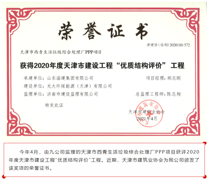 濟南監(jiān)理天津市西青生活垃圾綜合處理廠PPP項目獲評2020年度天津市建設(shè)工程“優(yōu)質(zhì)結(jié)構(gòu)評價”工程